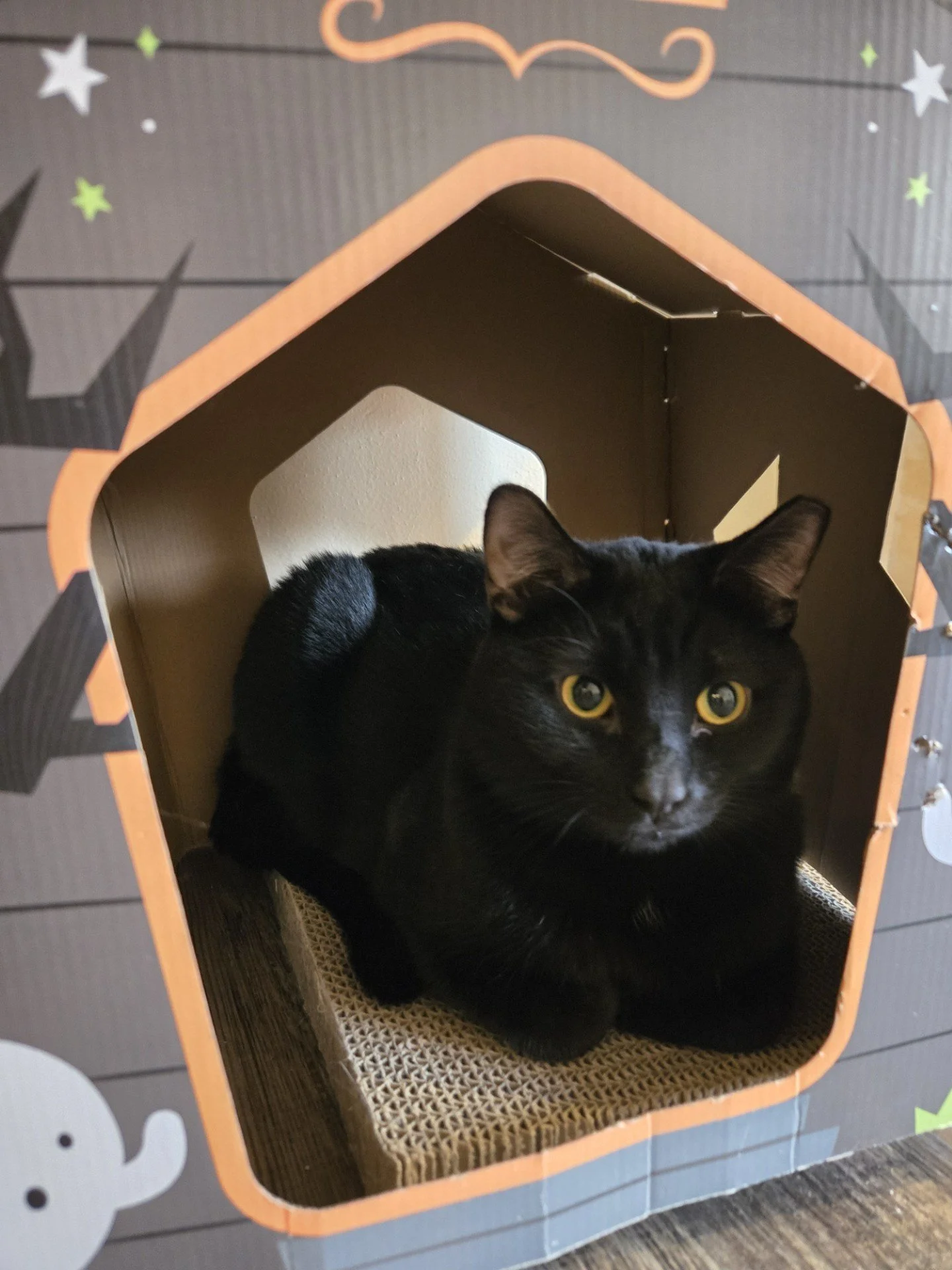 Binx & Pixel are a bonded pair who came to us when their owner could no longer care for them. Both can be shy when first meeting new people, but with patience and a gentle approach, their sweet personalities shine through. Binx is the more outgoing of the two—he enjoys attention, loves being pet, and has a playful side that comes out during wand toy time. Pixel is more reserved at first, but once she feels safe and comfortable, she blossoms into a very affectionate girl who truly enjoys pets and quiet attention.