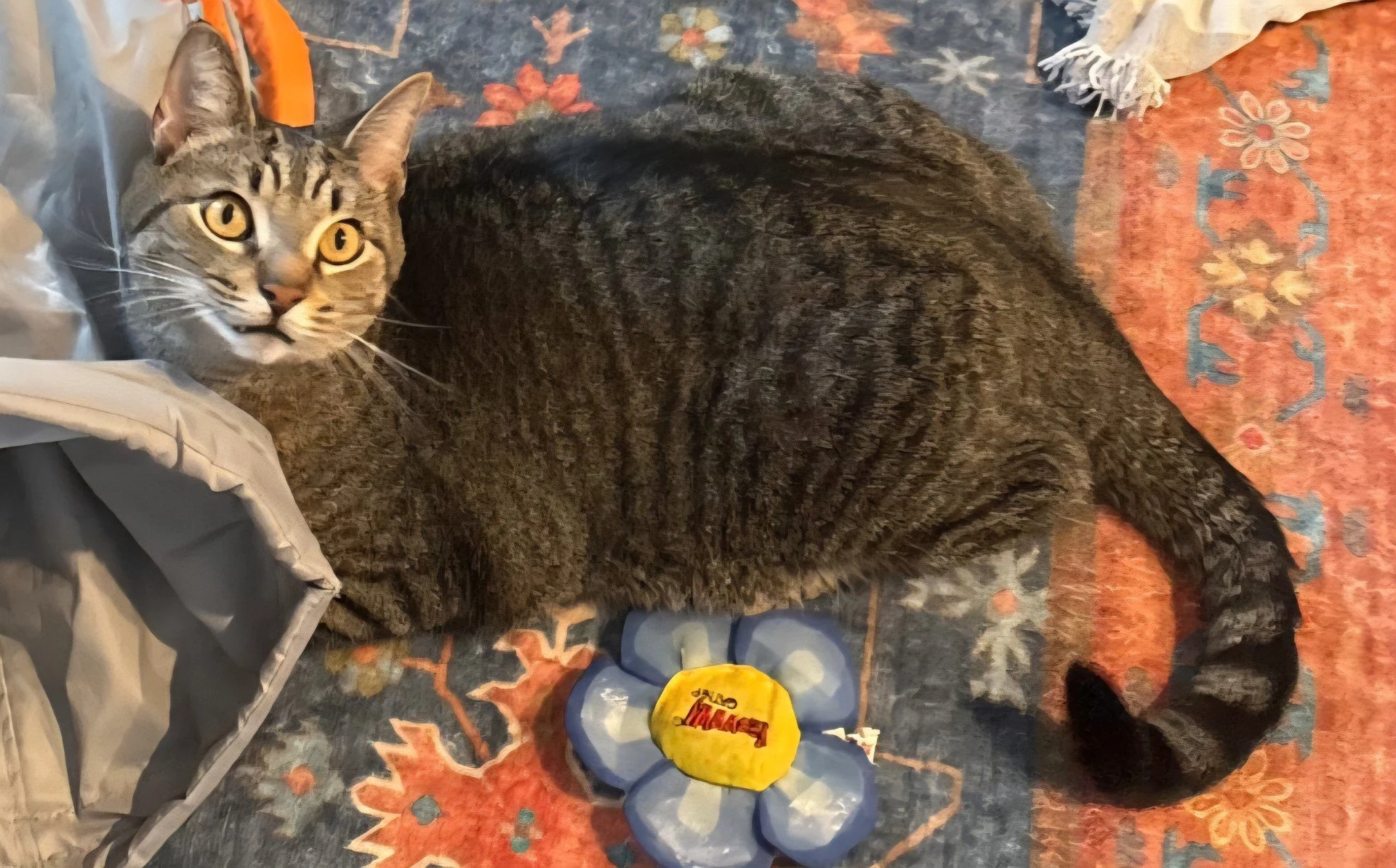 Fred came to us after his owner could no longer care for him, and while he may take a little time to warm up, it’s well worth the wait. Once he trusts you, Fred becomes an absolute love bug who adores being around his people. He’s a true “velcro kitty,” happily following you from room to room and chirping for pets when he wants attention. Curious and playful, Fred especially loves chasing string toys and can quickly turn into a ball of energy during playtime
