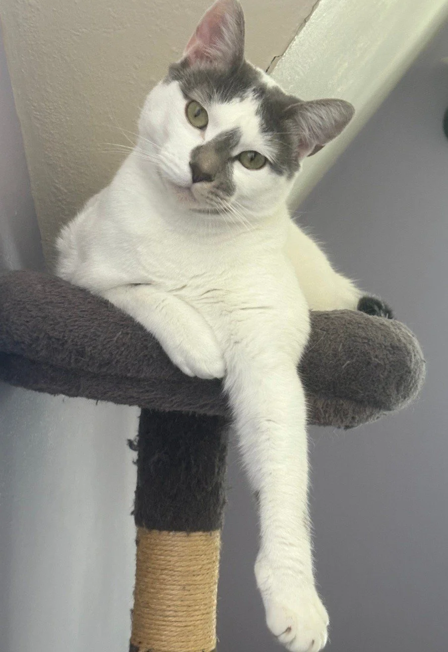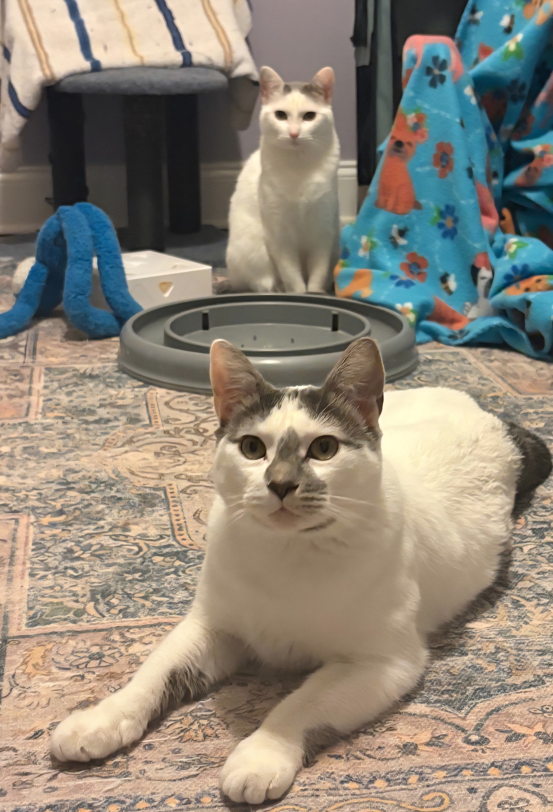 Both Maizy and Malachai are highly food motivated and never turn down their favorite Churu treats, which have been a great confidence booster for them. They enjoy interactive play with wand and feather toys, and catnip time is always a hit. They would do well with other cats and may adjust to a calm dog, and they’d do best with older, respectful children. This sweet bonded pair will thrive in a quiet, patient home with adopters committed to continuing their socialization journey and celebrating each small victory along the way